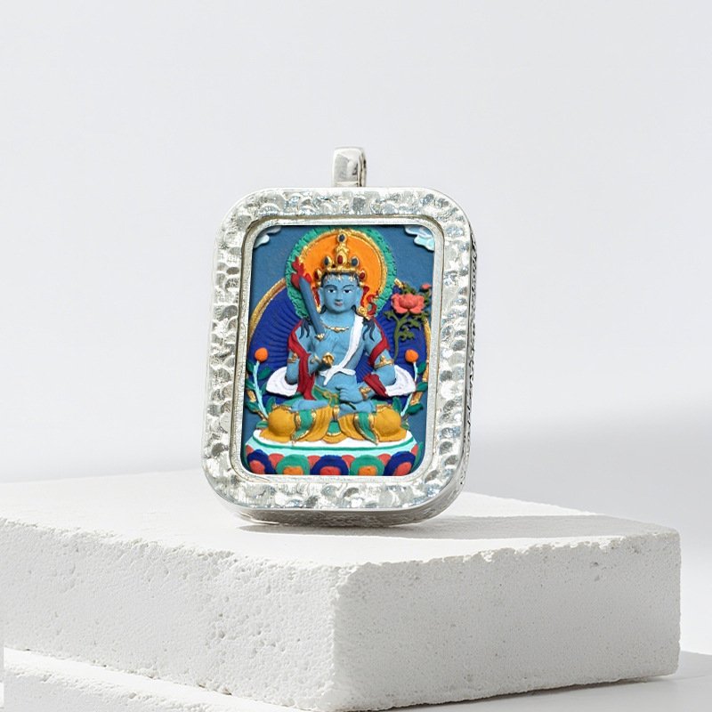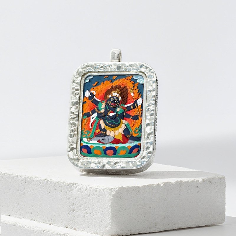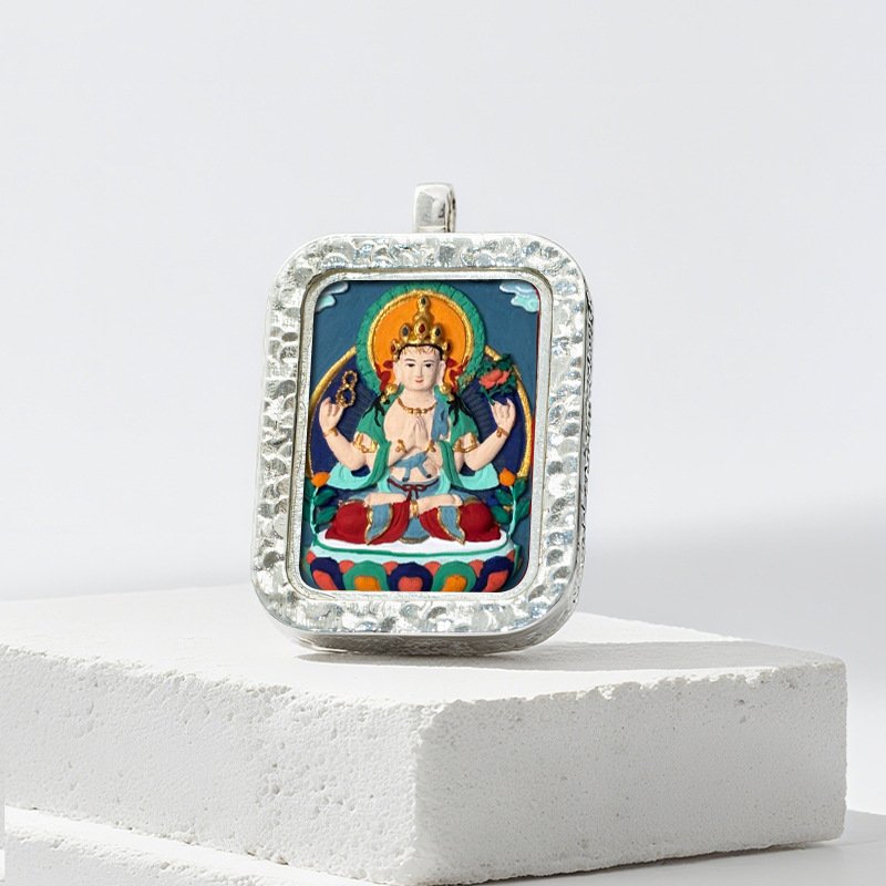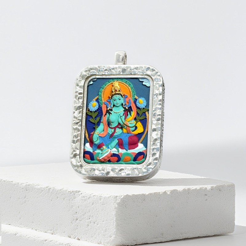 Authentic Tibetan Buddhist Hand-Painted Silver-Plated Tsa Tsa Thangka Pendant