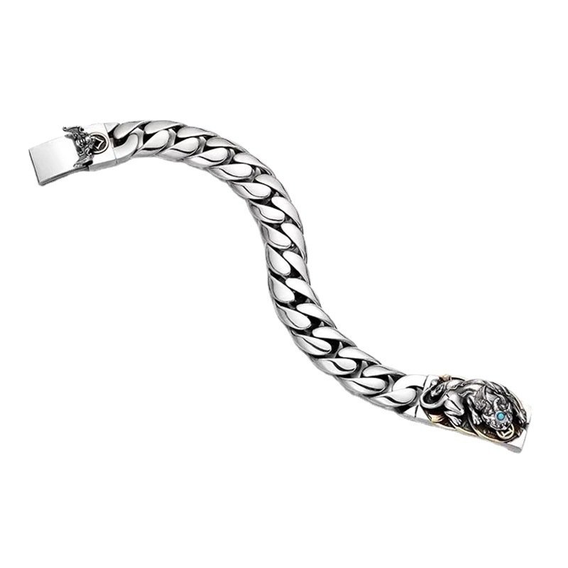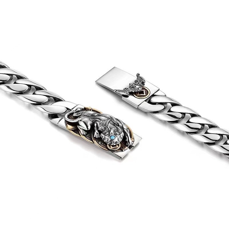 Handcrafted Tibetan Buddhist Pure Silver Pixiu Turquoise Wealth Bracelet for Men