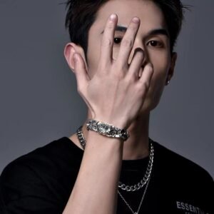 探索这款藏传佛教纯银貔貅绿松石手链,象征着招财、守护和男性力量。