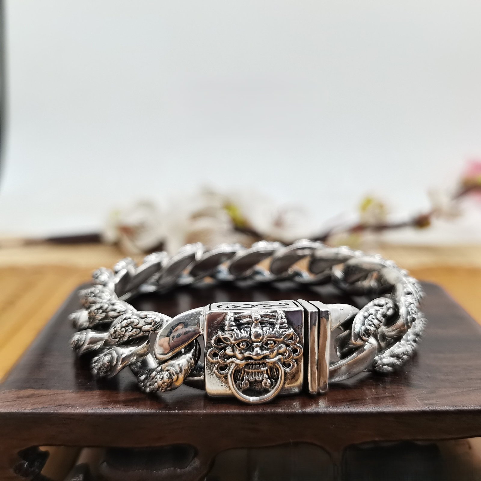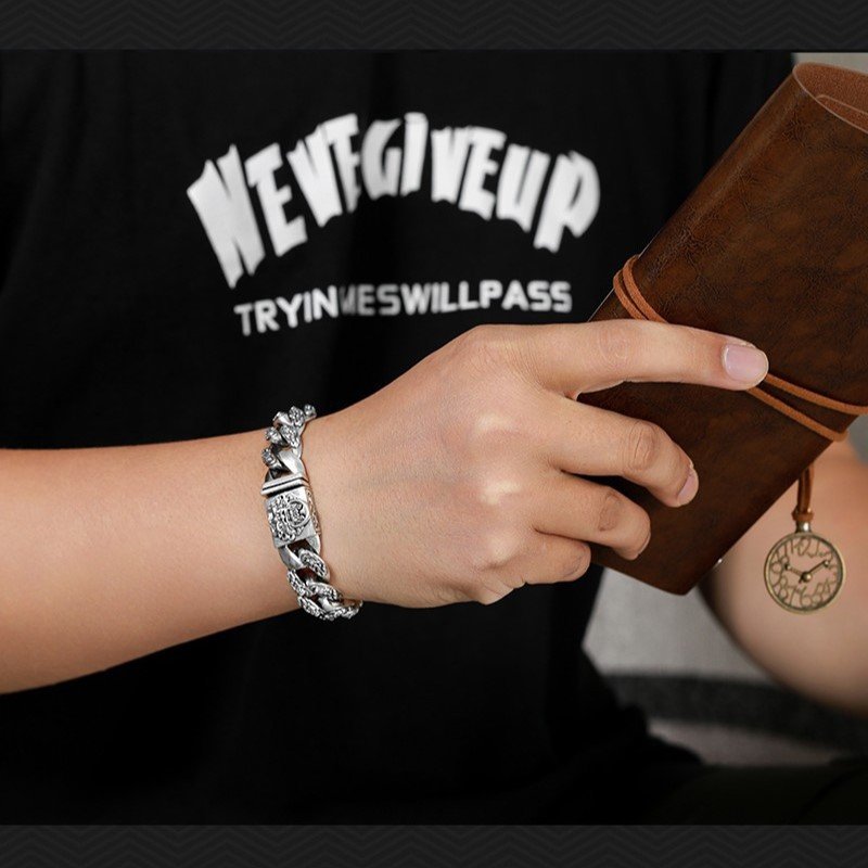 探索这款藏传佛教纯银复古貔貅手镯,象征着招财、守护和男性力量。