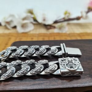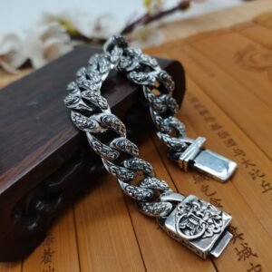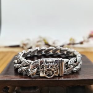 这款纯银复古貔貅手镯的设计灵感源自藏传佛教的象征意义和传统的财富护身符,代表着繁荣、保护和持久的力量