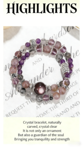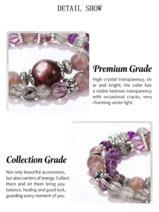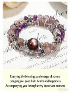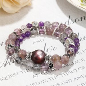 This mesmerizing bracelet is handcrafted with four distinctive natural crystals. Black rutilated quartz is revered for its protective energy, purple azeztulite enhances spiritual connection, purple aurora quartz embodies positive transformation, while purple lepidolite brings emotional calm and balance. It’s a perfect accessory for those pursuing spiritual growth and inner peace.