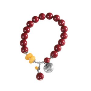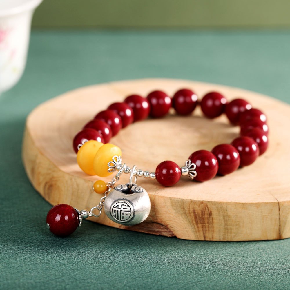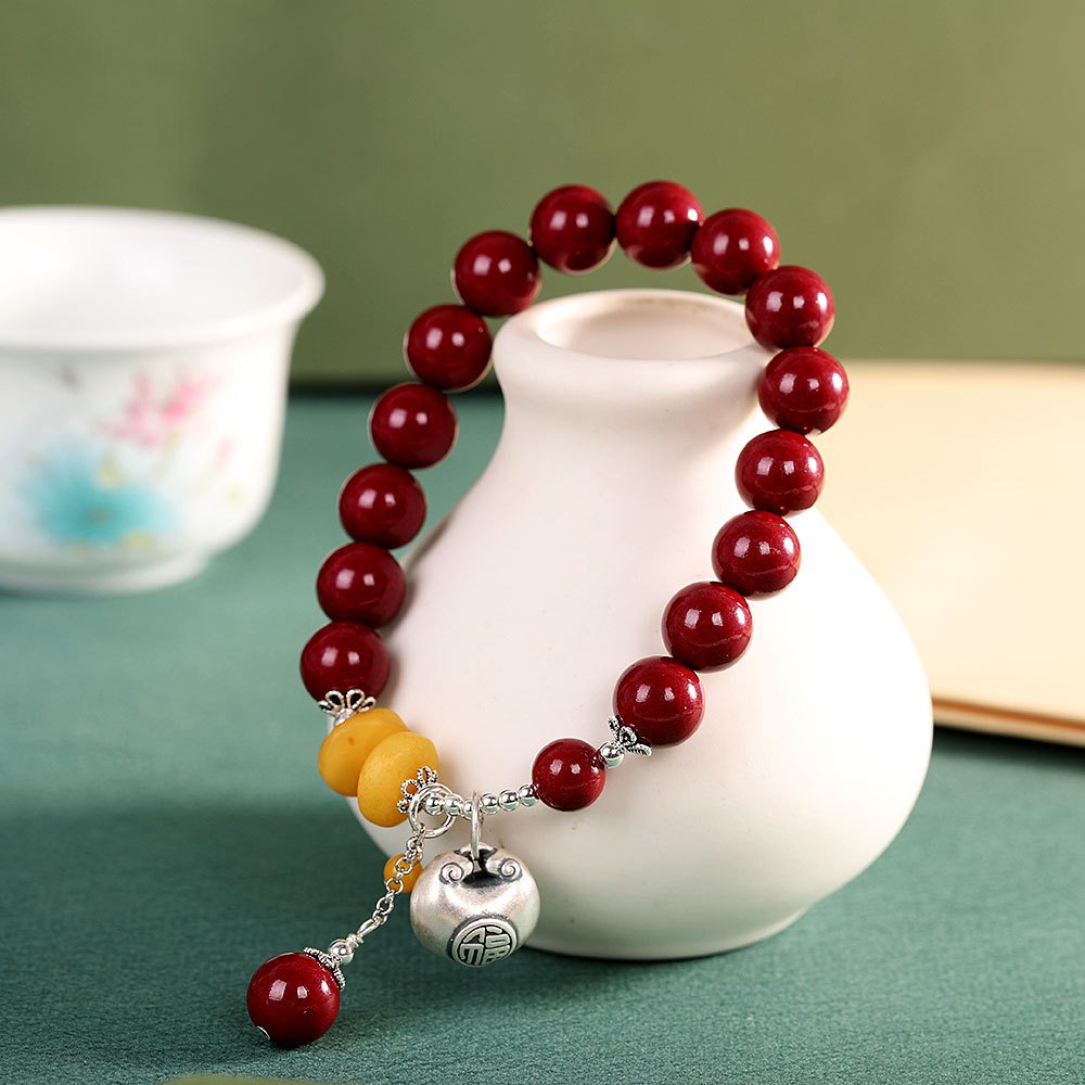 This exquisite bracelet combines S925 silver craftsmanship with natural cinnabar and amber beads, finished with a traditional Ruyi lock charm engraved with hundred blessings. A symbol of good fortune and protection in Eastern culture.