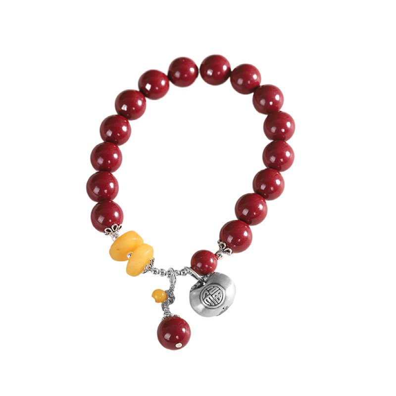 S925 Silver Bracelet with Natural Cinnabar, Amber & Hundred Blessings Ruyi Lock Charms