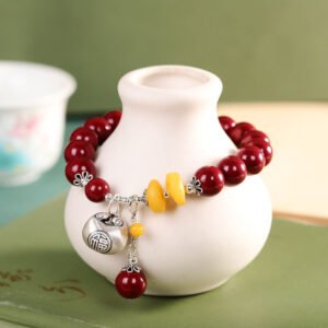 This exquisite bracelet combines S925 silver craftsmanship with natural cinnabar and amber beads, finished with a traditional Ruyi lock charm engraved with hundred blessings. A symbol of good fortune and protection in Eastern culture.