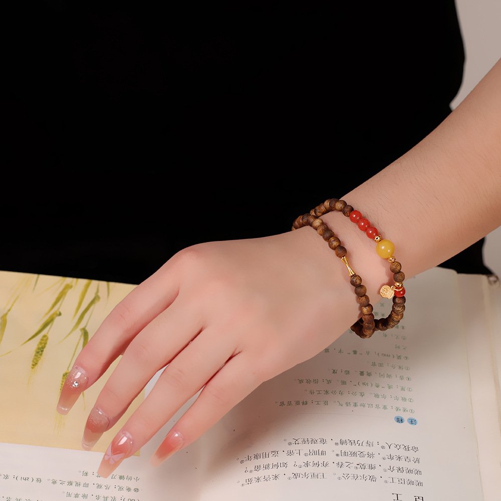 This handcrafted bracelet combines premium S925 silver, glossy gold plating, rare agarwood, natural amber and vivid red agate, carrying the profound blessings of Tibetan Buddhism for the wearer.