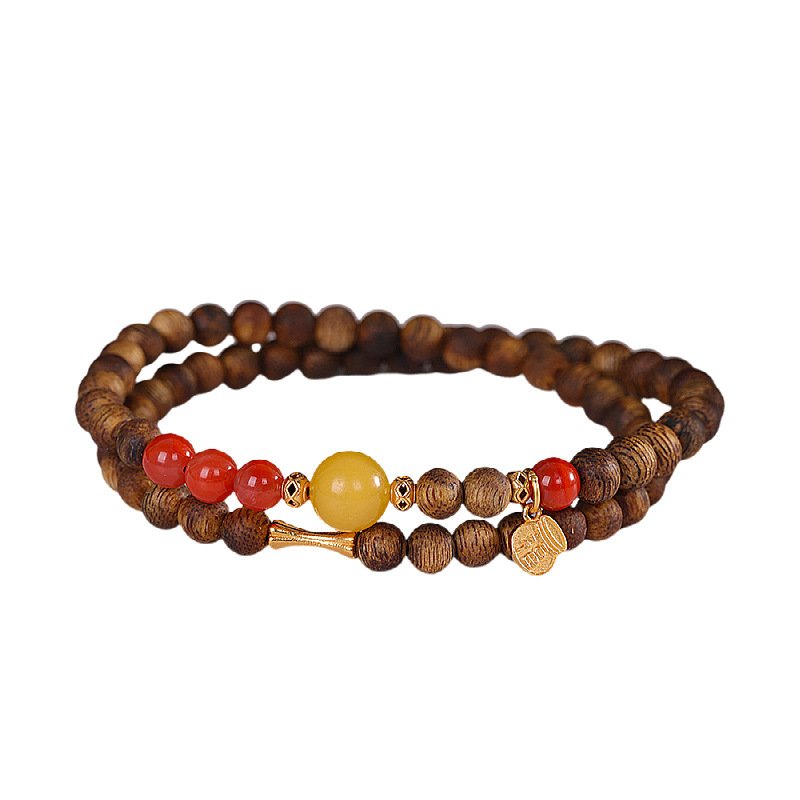 S925 Silver Tibetan Buddhist Gold-Plated Agarwood, Amber & Red Agate Bracelet