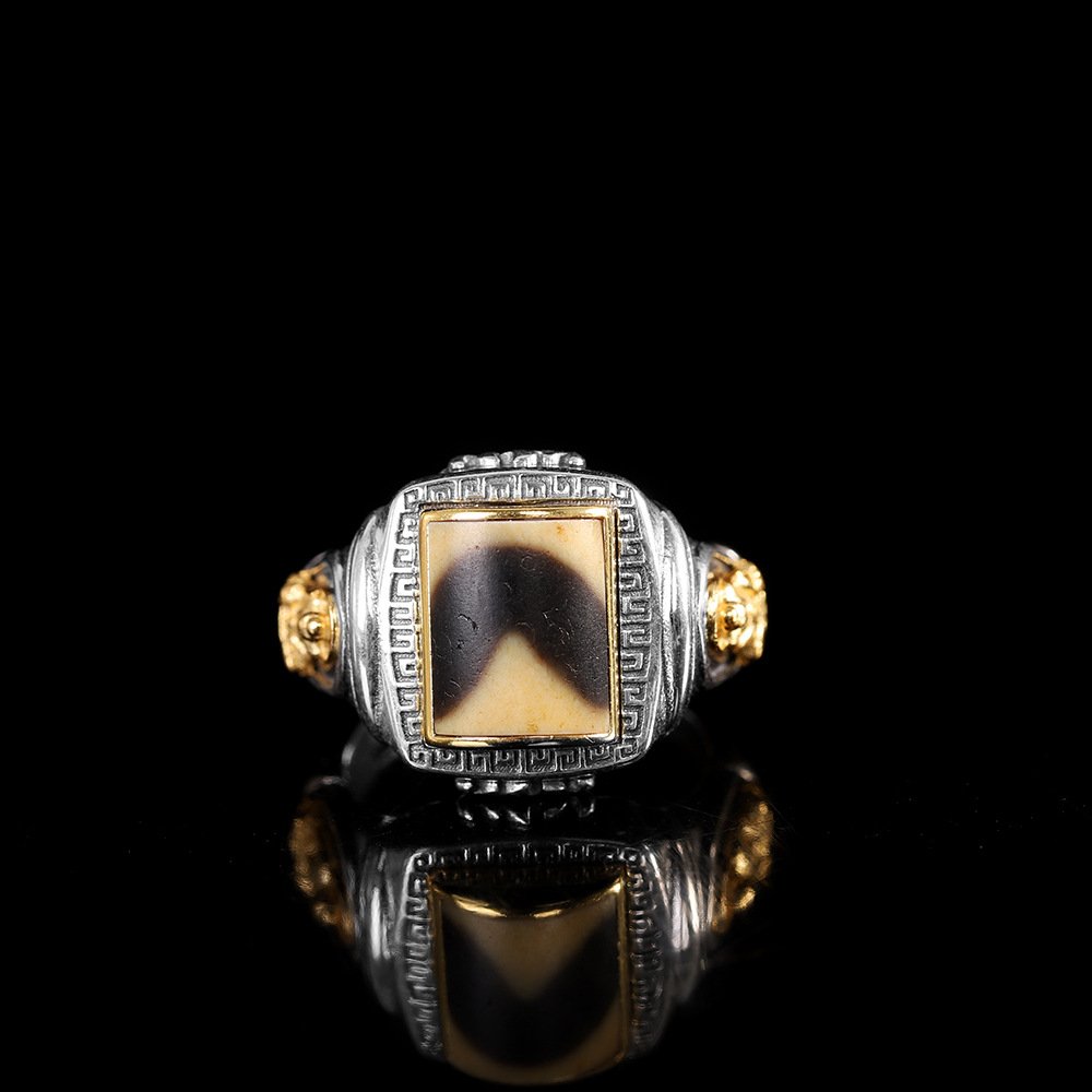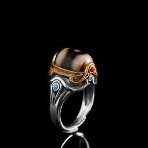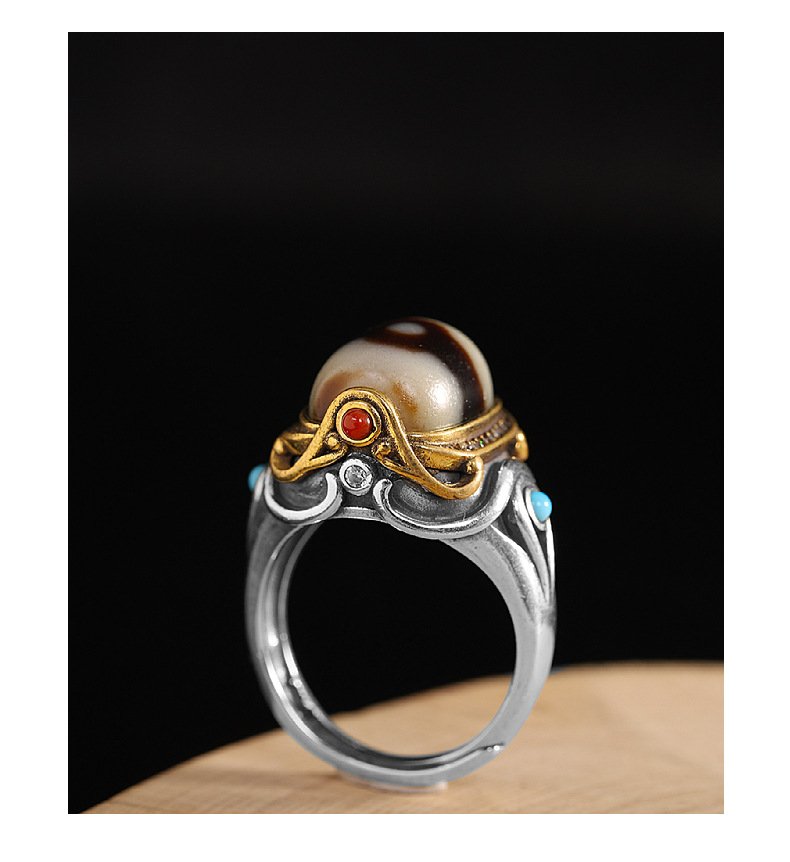 S925 Silver Tibetan Buddhist Premium Dzi Bead Adjustable Open Ring
