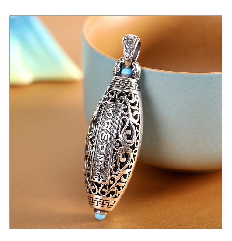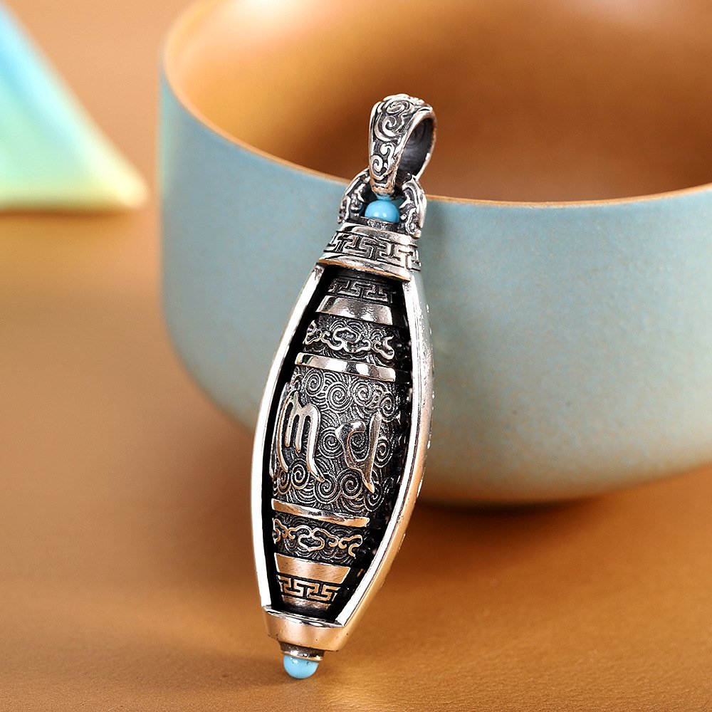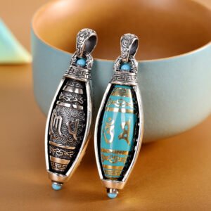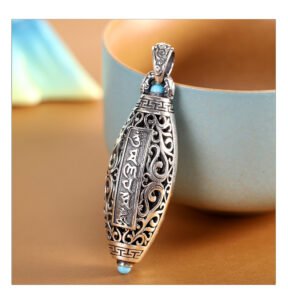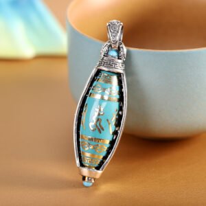 这款精心手工制作的吊坠结合了优质 S925 银、正宗天珠和神圣的六字真言雕刻,蕴含着藏传佛教对和平、保护和精神和谐的深刻祝福。