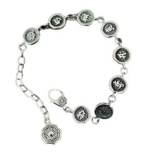 This meticulously crafted bracelet is made of premium S925 silver, decorated with the iconic Eight Auspicious Symbols—a set of sacred motifs representing good fortune, peace and prosperity in Tibetan Buddhist culture. It blends traditional ethnic artistry with modern wearing comfort, carrying warm blessings for daily wear and bringing positive energy to the wearer.