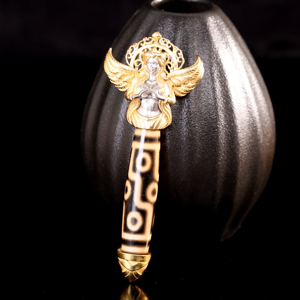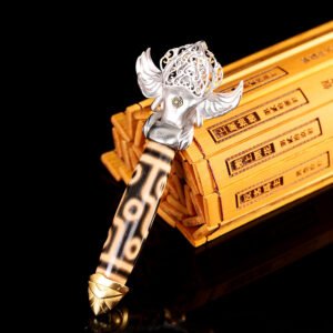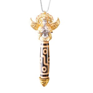 这款精心手工制作的吊坠结合了优质 S925 银、正宗天珠和藏传佛教智慧之佛文殊菩萨的神圣图案,为佩戴者带来洞察力和清晰的智慧。