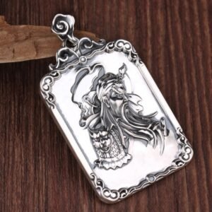 Inspired by Tibetan Buddhist tradition and Eastern warrior symbolism, this pure silver Guan Gong pendant necklace represents loyalty, righteousness, protection, and prosperity.