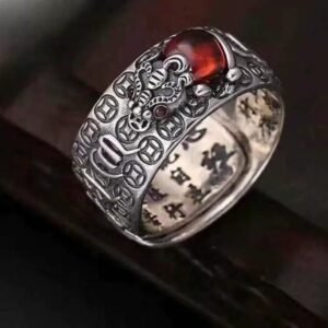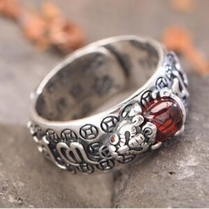 Discover a Tibetan Buddhist S925 silver Pixiu ring engraved with Om Mani Padme Hum and set with red garnet, symbolizing wealth, protection, and positive energy.