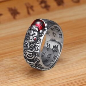 The ring features the Pixiu, a legendary creature revered for attracting wealth and guarding prosperity. Engraved with the Six-Character Mantra — Om Mani Padme Hum, the design embodies compassion, wisdom, and spiritual protection.
