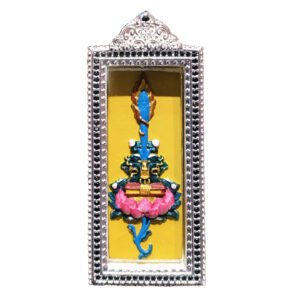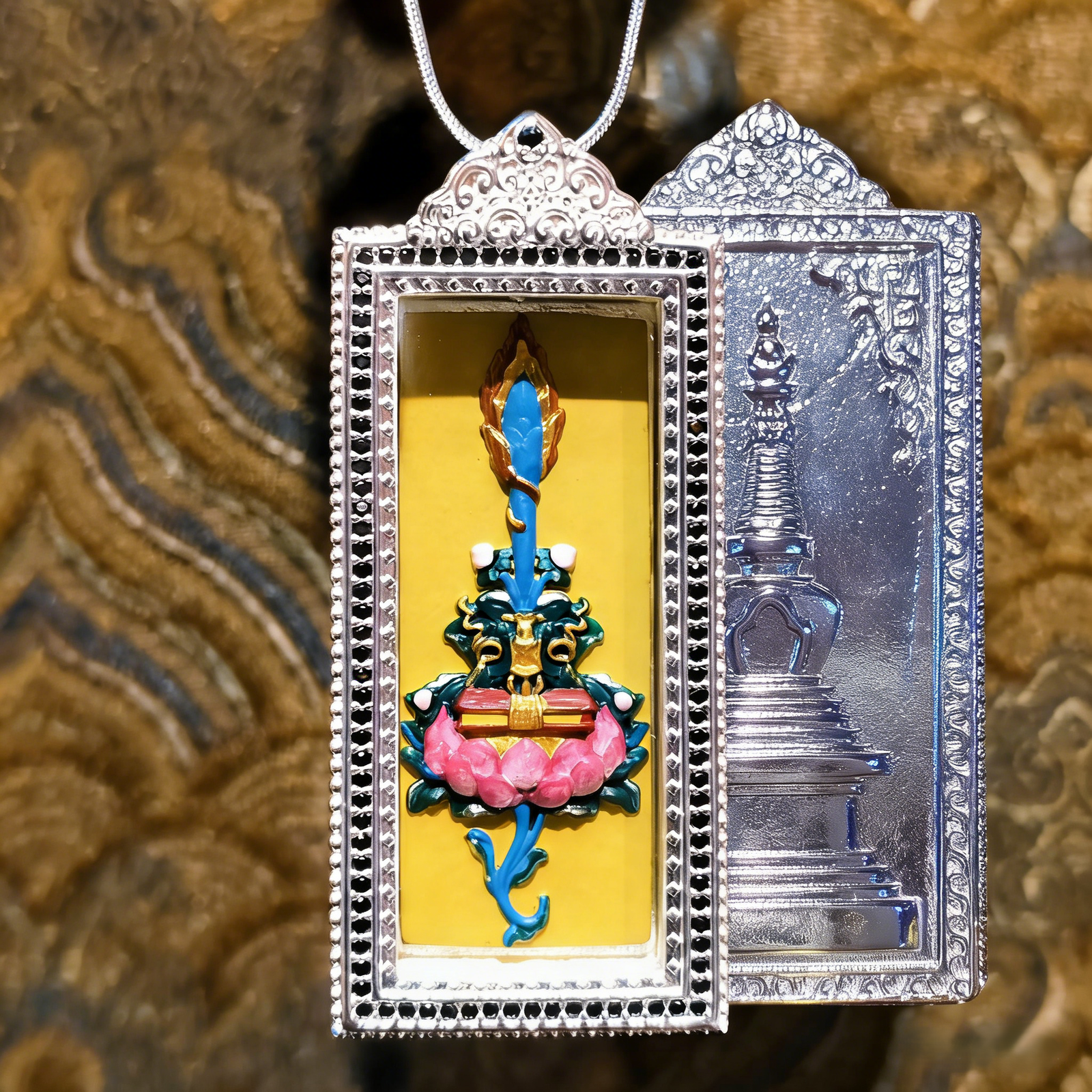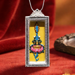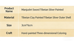 This exquisite pendant honors Manjushri, the Bodhisattva of Wisdom, whose sacred abode is Wutai Mountain. Adorned with the iconic Manjushri Sword motif and blessed tsa tsa, it is hand-painted with natural mineral pigments. In Tibetan Buddhism, this piece symbolizes the power of wisdom to cut through ignorance, making it a meaningful accessory for daily wear and a precious collectible for spiritual jewelry lovers.