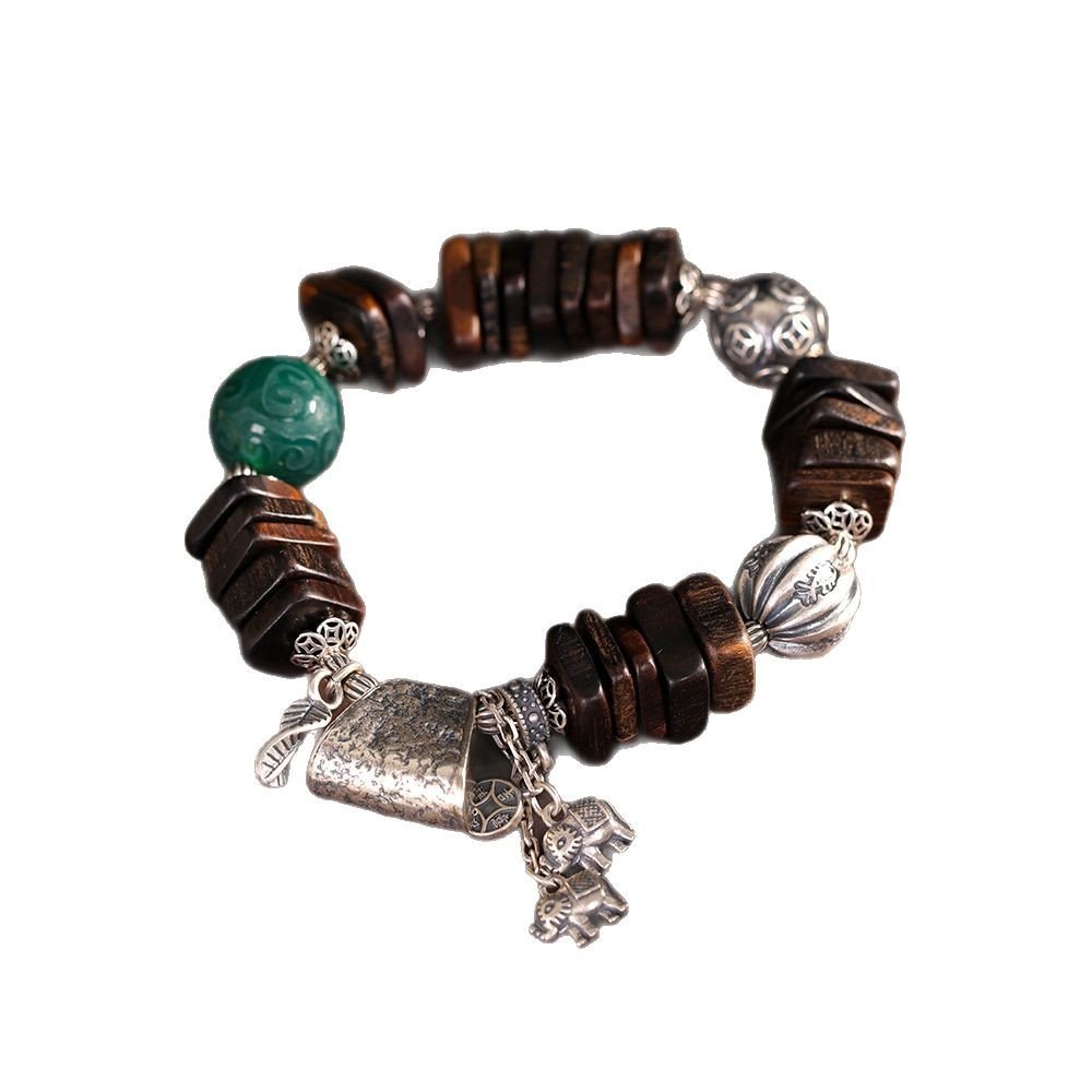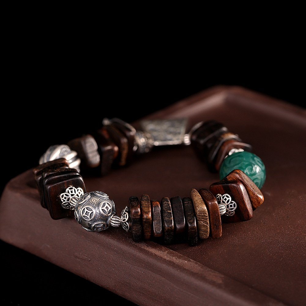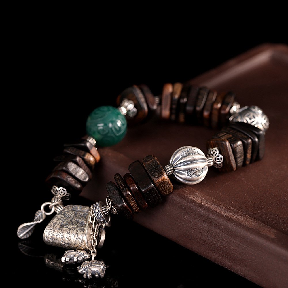 This meticulously handcrafted prayer bead bracelet blends three distinctive materials—ethnic Tibetan silver, smooth green agate and aromatic agarwood, all deeply rooted in Tibetan Buddhist culture. It carries blessings of peace and harmony, making it a unique spiritual accessory for daily wear and a precious collection for jewelry lovers.
