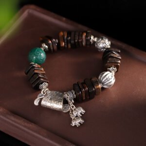 This meticulously handcrafted prayer bead bracelet blends three distinctive materials—ethnic Tibetan silver, smooth green agate and aromatic agarwood, all deeply rooted in Tibetan Buddhist culture. It carries blessings of peace and harmony, making it a unique spiritual accessory for daily wear and a precious collection for jewelry lovers.