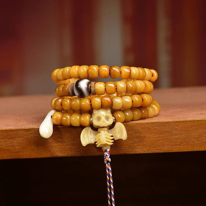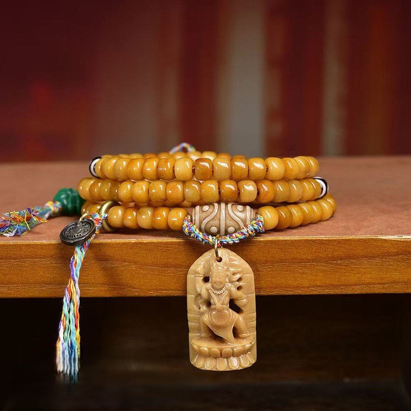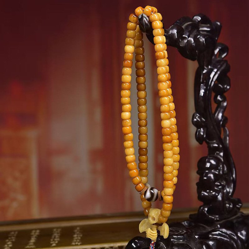 This authentic 108-bead mala is a masterpiece of Tibetan craftsmanship, combining intricately carved yak bone beads, smooth natural agate, and sacred dzi beads. In Tibetan Buddhist culture, dzi beads symbolize protection and good fortune, while the 108-bead count holds profound significance for meditation. The vintage finish carries the unique charm of Himalayan artistry, making it a sacred spiritual accessory and a rare collectible for ethnic culture enthusiasts.