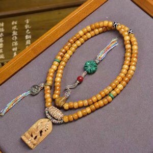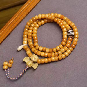 This authentic 108-bead mala is a masterpiece of Tibetan craftsmanship, combining intricately carved yak bone beads, smooth natural agate, and sacred dzi beads. In Tibetan Buddhist culture, dzi beads symbolize protection and good fortune, while the 108-bead count holds profound significance for meditation. The vintage finish carries the unique charm of Himalayan artistry, making it a sacred spiritual accessory and a rare collectible for ethnic culture enthusiasts.