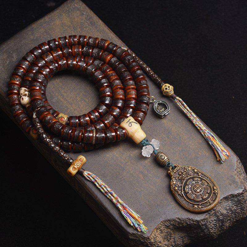 Tibetan Buddhist Premium Vintage Carved Yak Bone Nine Palaces Bagua Mala – 108 Prayer Beads