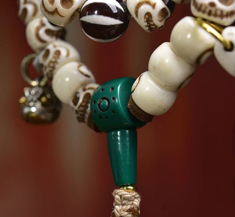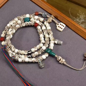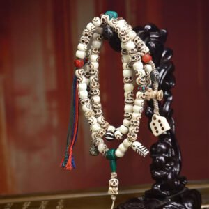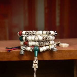 Tibetan Buddhist Premium Vintage Citipati Carved Bone & Agate Mala – 108 Prayer Beads