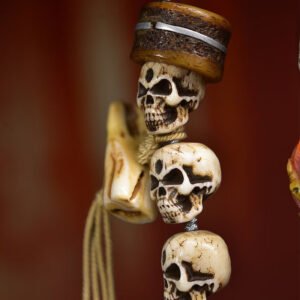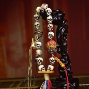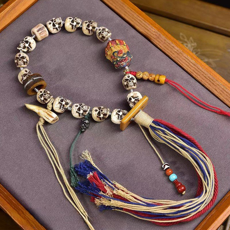 This remarkable mala features intricately carved bone beads adorned with the iconic Citipati motif—a sacred symbol in Tibetan Buddhism representing impermanence and spiritual awakening. The vintage finish reflects the time-honored craftsmanship of Himalayan artisans, while the beadwork carries profound spiritual significance for meditation practice. It is a unique blend of ethnic heritage and spiritual meaning, ideal for collectors and practitioners alike.