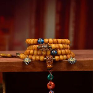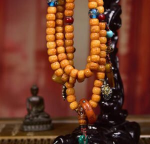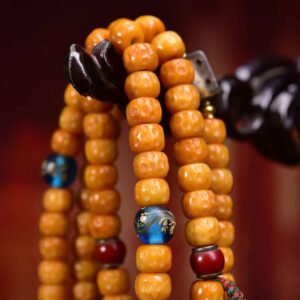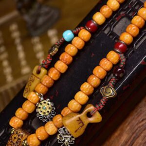 This authentic Tibetan mala features 108 meticulously carved yak bone barrel beads, a classic design rooted in Tibetan Buddhist tradition. The vintage finish and intricate carvings reflect the time-honored craftsmanship of Himalayan artisans, while the 108-bead count holds deep spiritual significance for meditation and mindfulness practice.