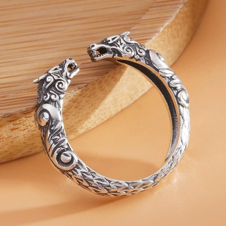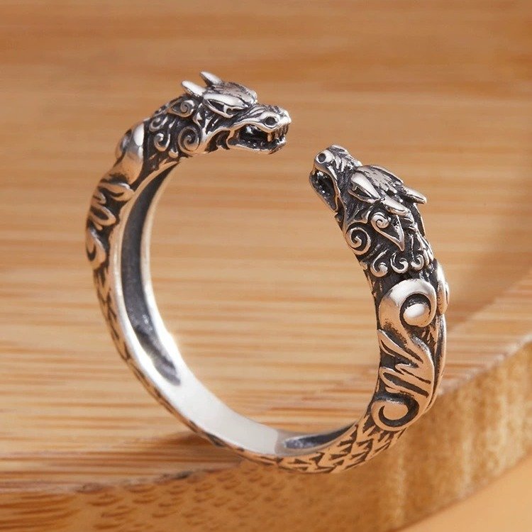 Inspired by Tibetan Buddhist symbolism and ancient Eastern mythology, this pure silver double dragon pearl vintage men’s ring represents power, protection, and harmony.