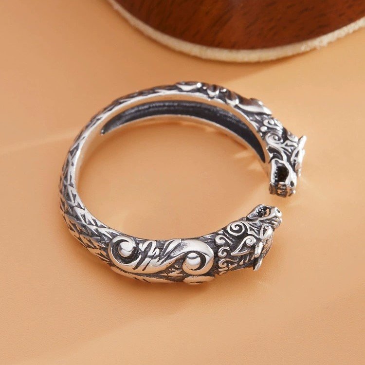 Crafted from pure silver with a vintage finish, this ring embodies bold masculinity and timeless craftsmanship. The detailed dragon engraving reflects the union of opposing forces, making it a meaningful talisman for those who value strength guided by wisdom.