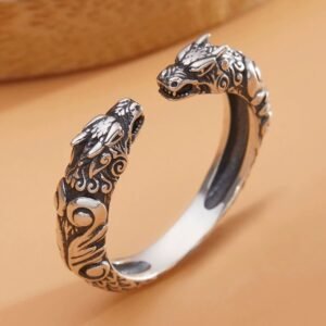 Inspired by Tibetan Buddhist symbolism and ancient Eastern mythology, this pure silver double dragon pearl vintage men’s ring represents power, protection, and harmony.
