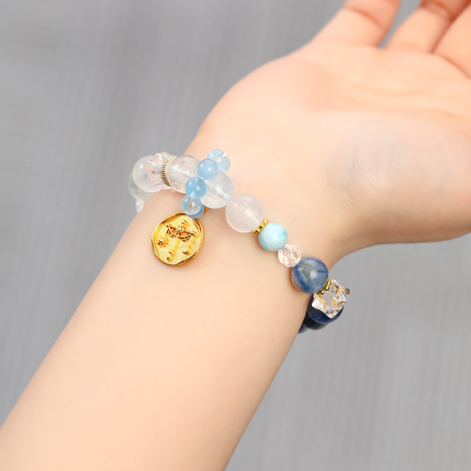 This elegant Libra bracelet is handcrafted with natural aquamarine and white-blue rabbit hair quartz. Aquamarine brings calming and communicative energy, while rabbit hair quartz symbolizes intuition and inner peace—making it a perfect accessory for the balanced and harmonious Libra.
